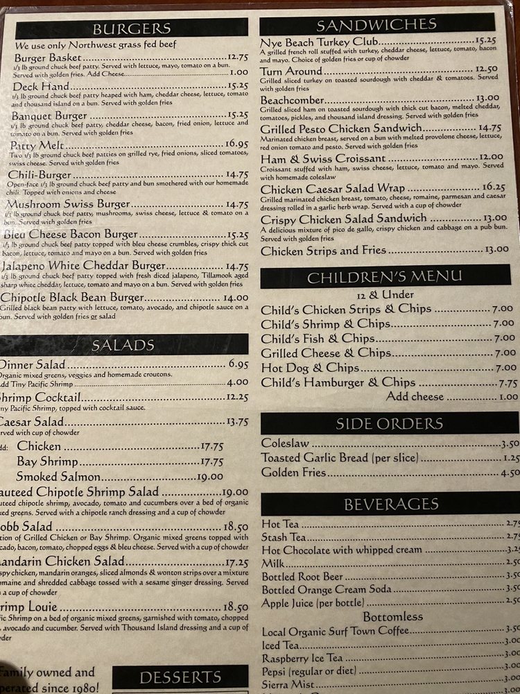 For heartier options, Chowder Bowl also serves mouthwatering burgers and sandwiches, such as the Nye Beach Turkey Club and the flavorful Deck Hand burger. With a welcoming atmosphere, ideal for families and groups, and notable happy hour specials, it’s a perfect spot for a delightful lunch or dinner. Don’t miss the bread pudding—a sweet finale that promises to be a delicious end to your visit!